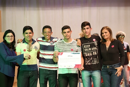 Início → Membros do projeto “Cruzando os Sertões da Mata Branca: Educação e Sustentabilidade na Caatinga” no palco do teatro Diplomata, em Salvador (BA).